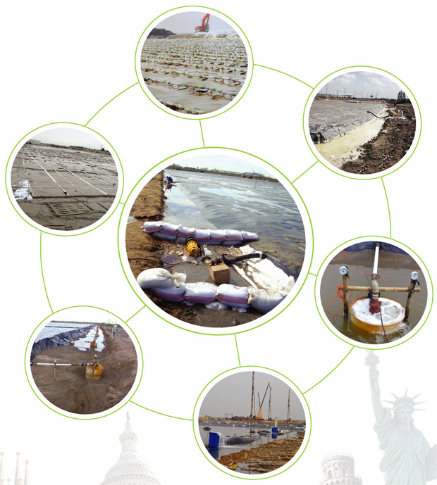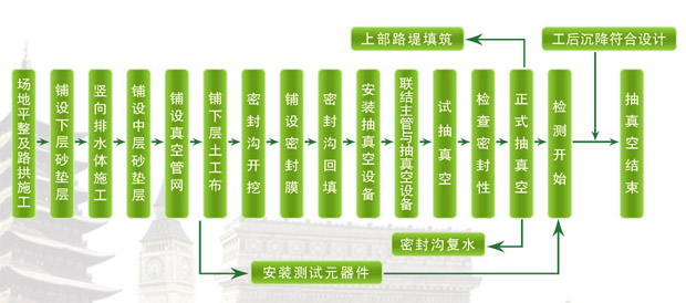 真空预压法是在需要加固的软土地基表面先铺设砂垫层.然后埋设垂直排水管道,再用不透气的封闭膜使其与 大气隔绝.薄膜四周埋入土中,通过砂垫层内埋设的吸水管道,用真空装置进行抽气.使其形成真空,增加地基的 有效应力。 当抽真空时,先后在地表砂垫层及竖向排水通道内逐步形成负压,使土体内部与排水通道,垫层之间形成压差。 在此压差作用下,土体中的}L隙水不断由排水通道排出,从而使土体固结。 真空预压的原理主要反映在以下几个方面: 1)薄膜上面承受等于薄膜内外压差的荷载。 2)地下水位降低.相应增加附加应力。 3)封闭气泡排出.土的渗透性加大 真空预压是通过覆盖于地面的密封膜下抽真空,使膜内外形成气压差.使粘土层产生固结压力。即是在总应力 不变的情况下.通过减小孔隙水压力来增加有效应力的方法。真空预压和降水预压是在负超静水压力下排水固结. 称为负压固结。 真空预压施工前,应充分作好施工准备工作,制定施工技术措施。检验沙袋、聚氯乙烯薄膜及中粗砂是否符合 技术标准及设计要求.并将检验报告提交监理工程师审核批准。在取得监理工程师批准后,开始进行真空预压的下 一步施工。 真空预压施工流程:测量放线→铺设主支滤排水管→铺设上层砂垫层→砂面整平→铺设聚氯乙烯薄膜→施工密 封沟→设置测量标志→安装真空泵→抽真空预压固结土层。 |